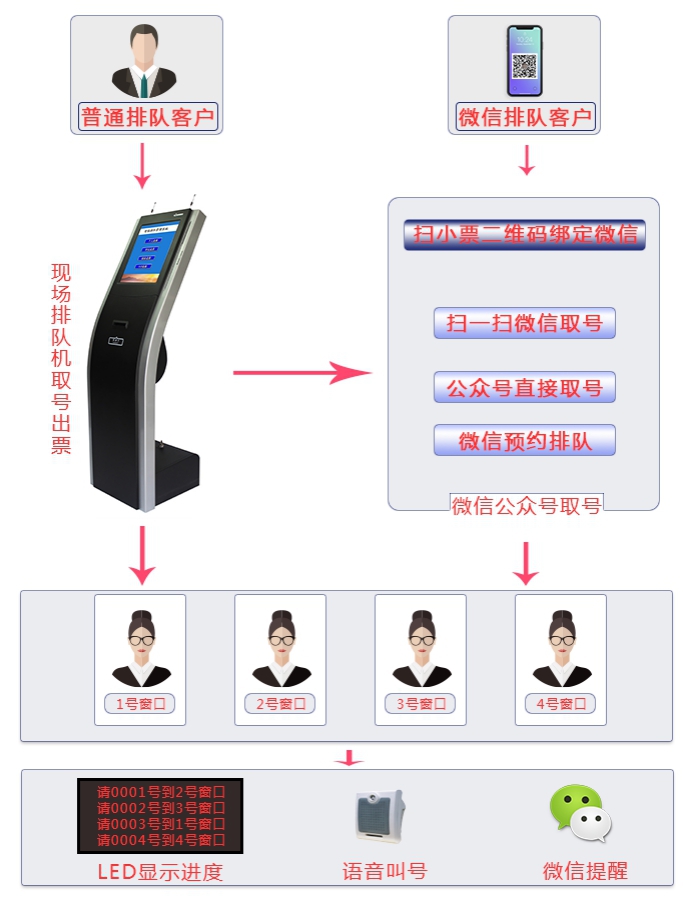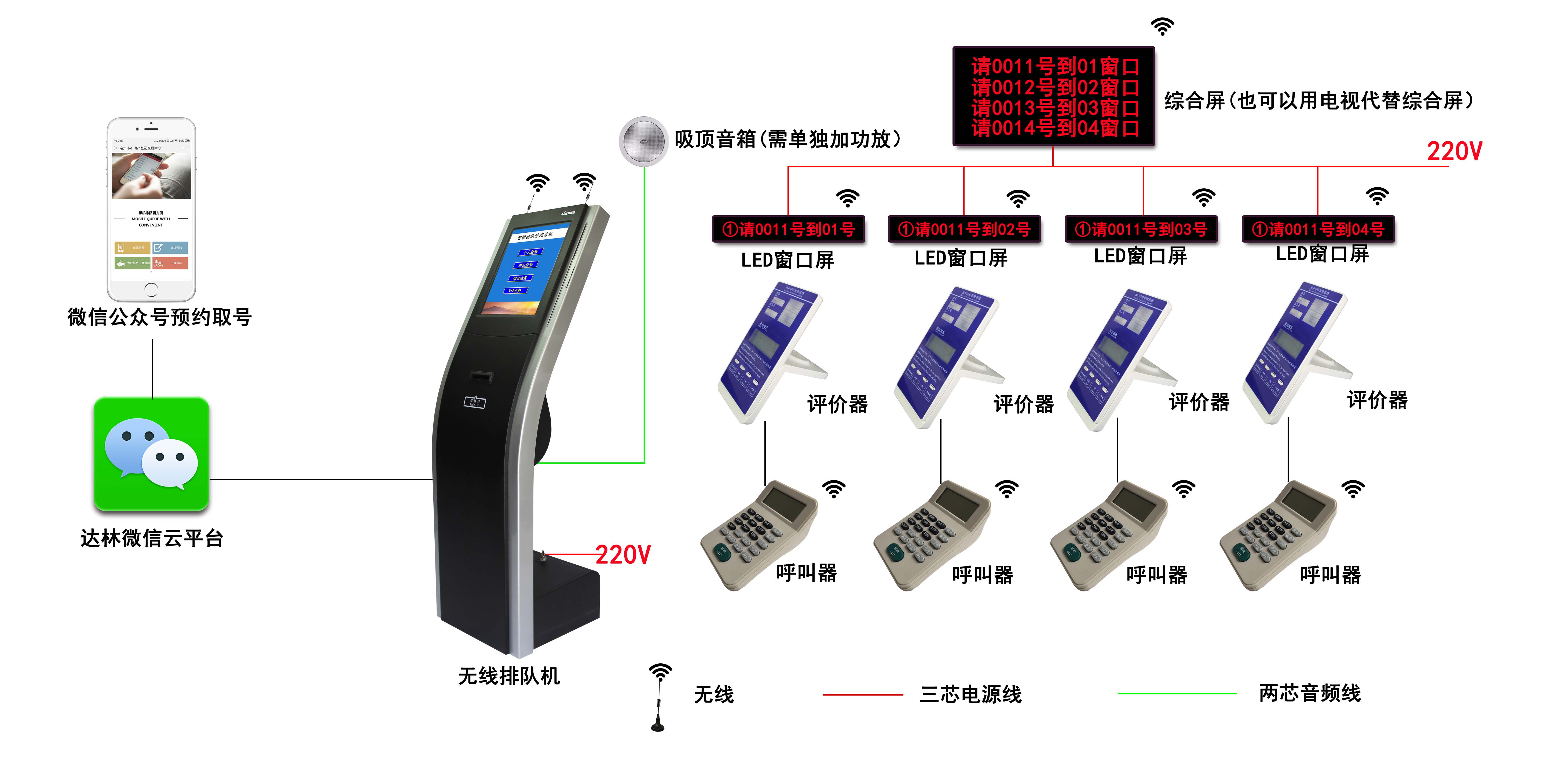 在傳統(tǒng)排隊方式的基礎(chǔ)上,客戶利用智能手機(jī)通過關(guān)注微信公眾平臺進(jìn)入達(dá)林科技微信排隊系統(tǒng),進(jìn)行業(yè)務(wù)辦理排隊取號、預(yù)約、查看進(jìn)度等操作。