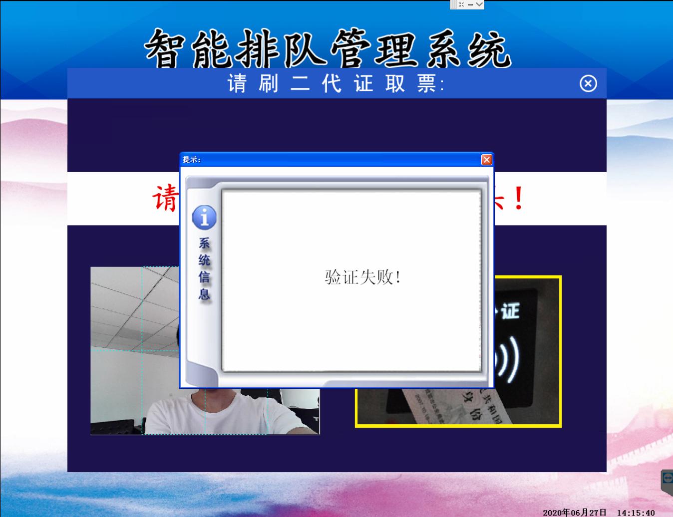 5、若“人臉”和“身份證”不是同一個(gè)人,或者相差很大,則系統(tǒng)會(huì)提示“驗(yàn)證失敗”將不會(huì)打印出票號(hào)。