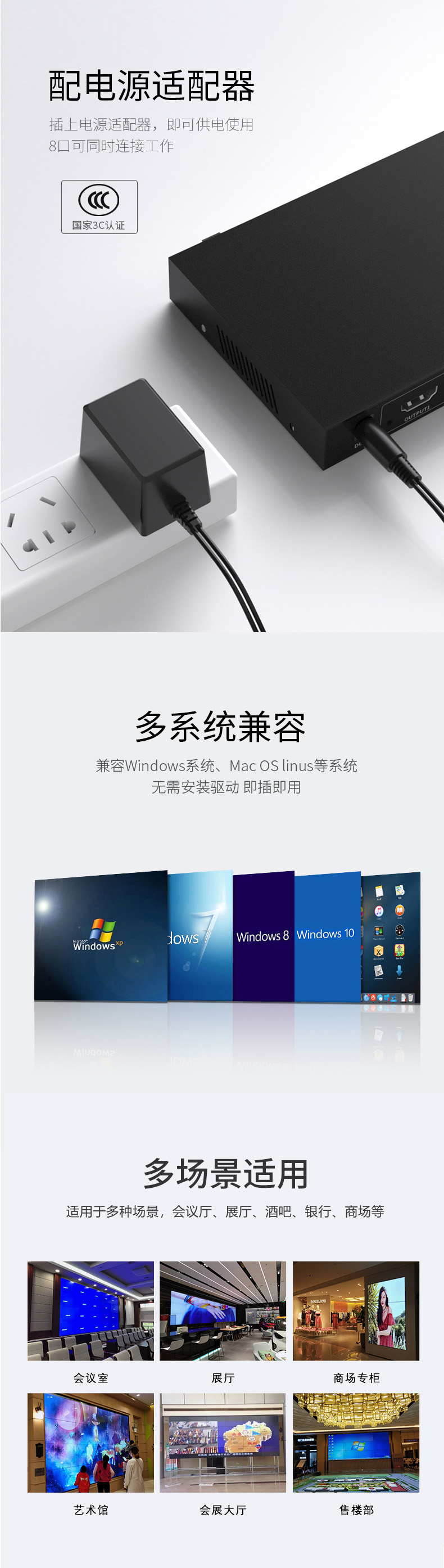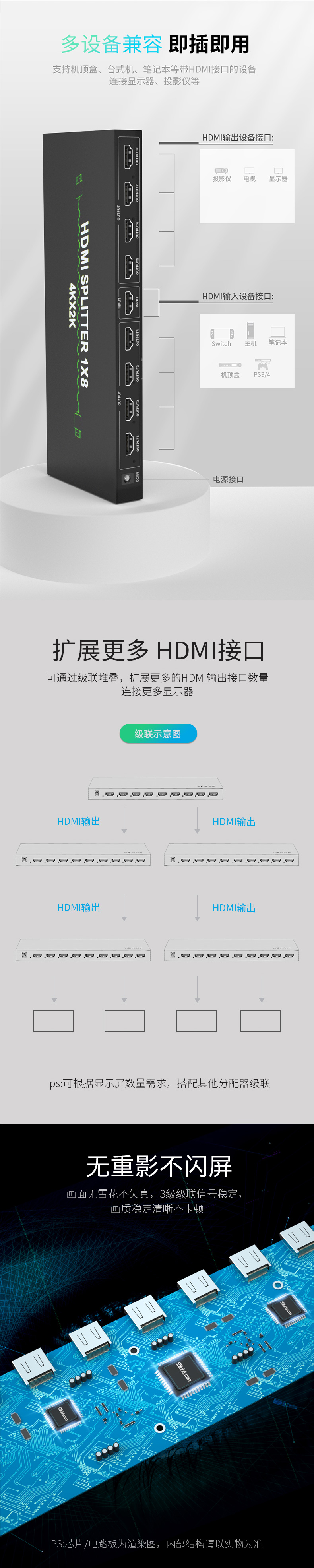 產(chǎn)品用途:搭配拼接屏使用,連接拼接屏與電腦主機,支持1路HDMI信號輸入,8路輸出,支持整屏顯示